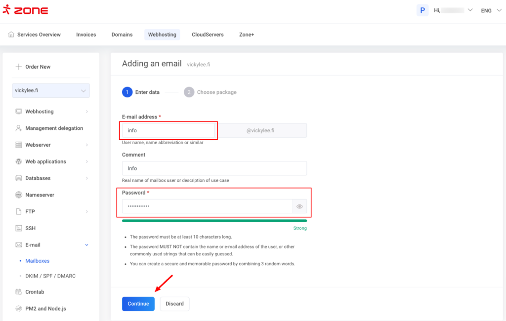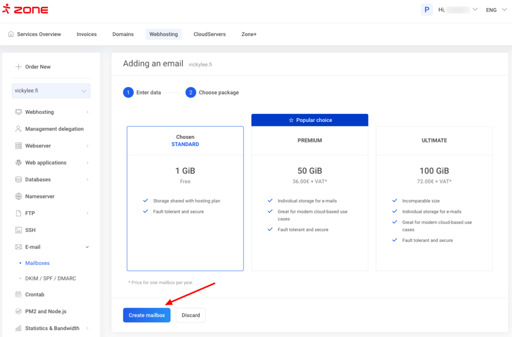 Next step is to choose a suitable package for you mailbox and after clicking Create mailbox
