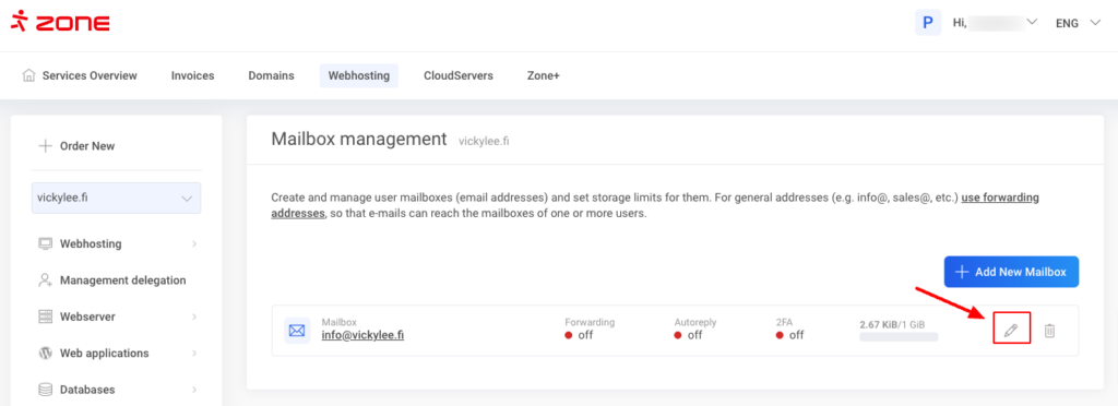 After the email account is created you can manage and edit it by clicking on the pencil icon.