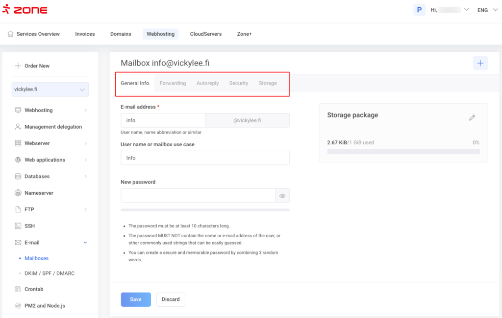 On the next page you can set up a an autoreply, forward a copy of emails, change the password, upgrade storage package and manage security setting such as 2fa, application passwords and change the spam filter rating.