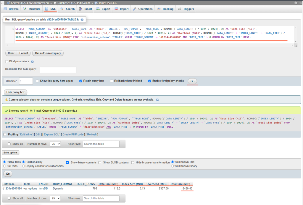 It can be seen that the size of this WordPress’ options table is 113.3 MiB. But under the unreleased space is stuck 8337 MiB or 8.1 GiB – that’s more than 70 times the size of the table’s data!