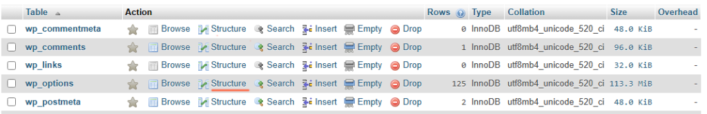 If database has a large number of tables and you don’t know which of them might have a large overhead. A faster way to find the problematic table than checking each Structure tab is by using this SQL query.