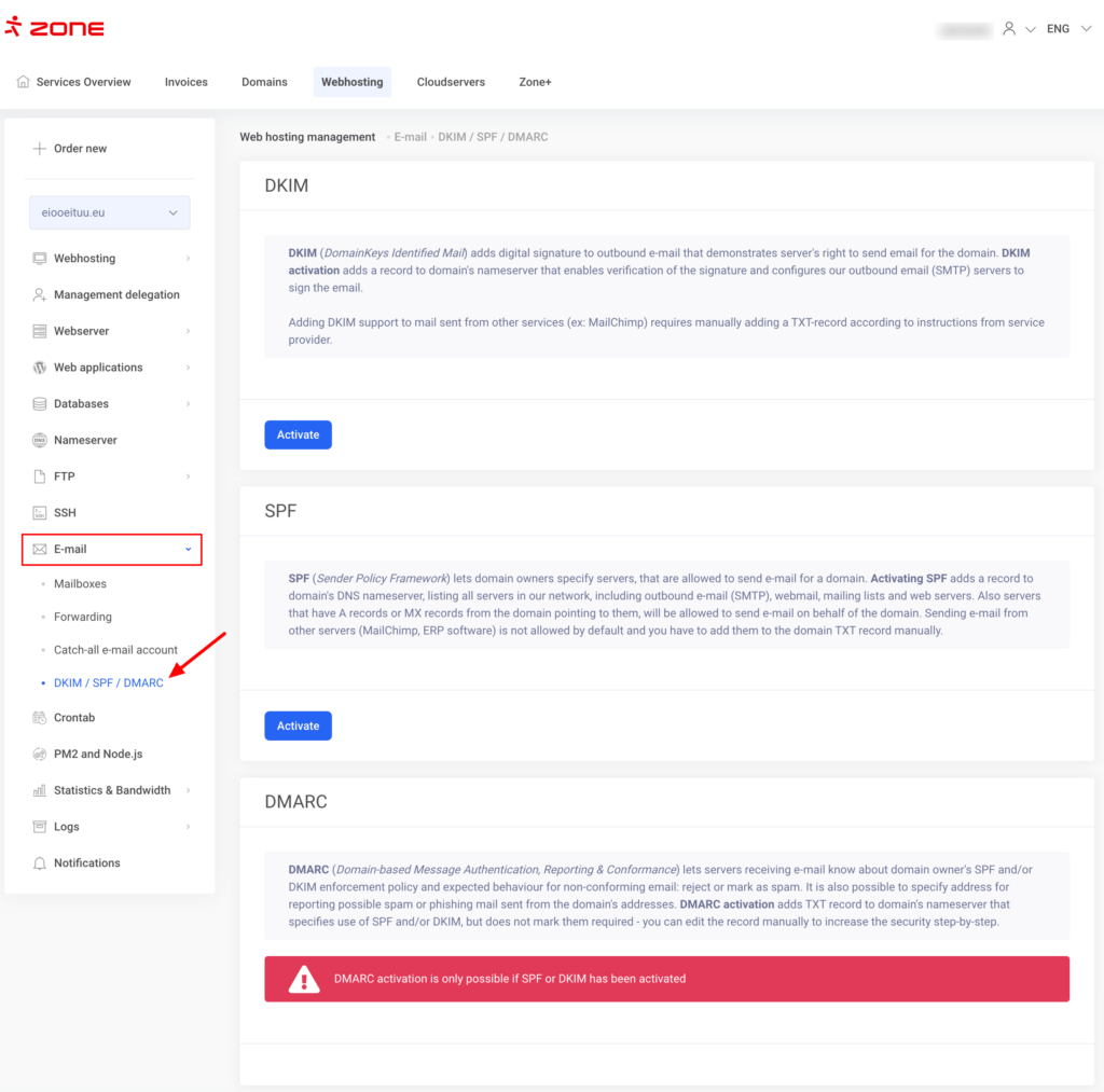 DKIM technology can be activated in the My Zone control panel, through the server management under E-mail