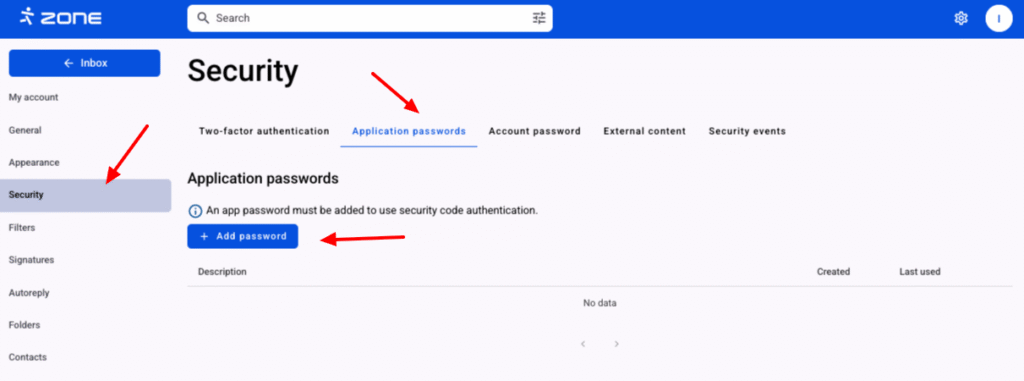 Email application passwords can be added under Security -> Application passwords by clicking on the Add password button.