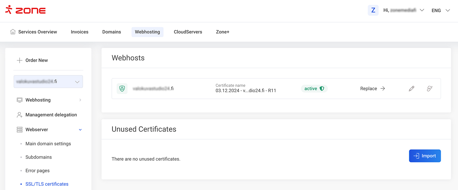 All installed certificates can be checked through Webhosting Management. On the Services overview