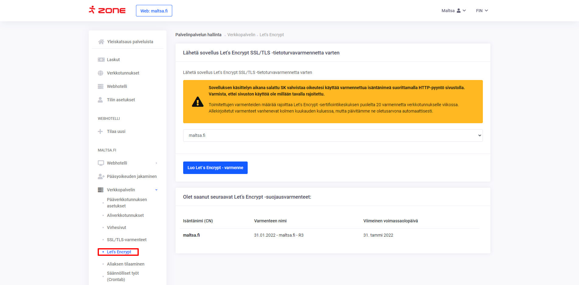 HTTPS is always active in the Zone web hostings and network traffic is protected with a free Let’s Encrypt certificate. The certificate also covers all alias domains that can be added, both in the main and subdomains. The Let’s Encrypt certificate has a good security level and is renewed automatically.