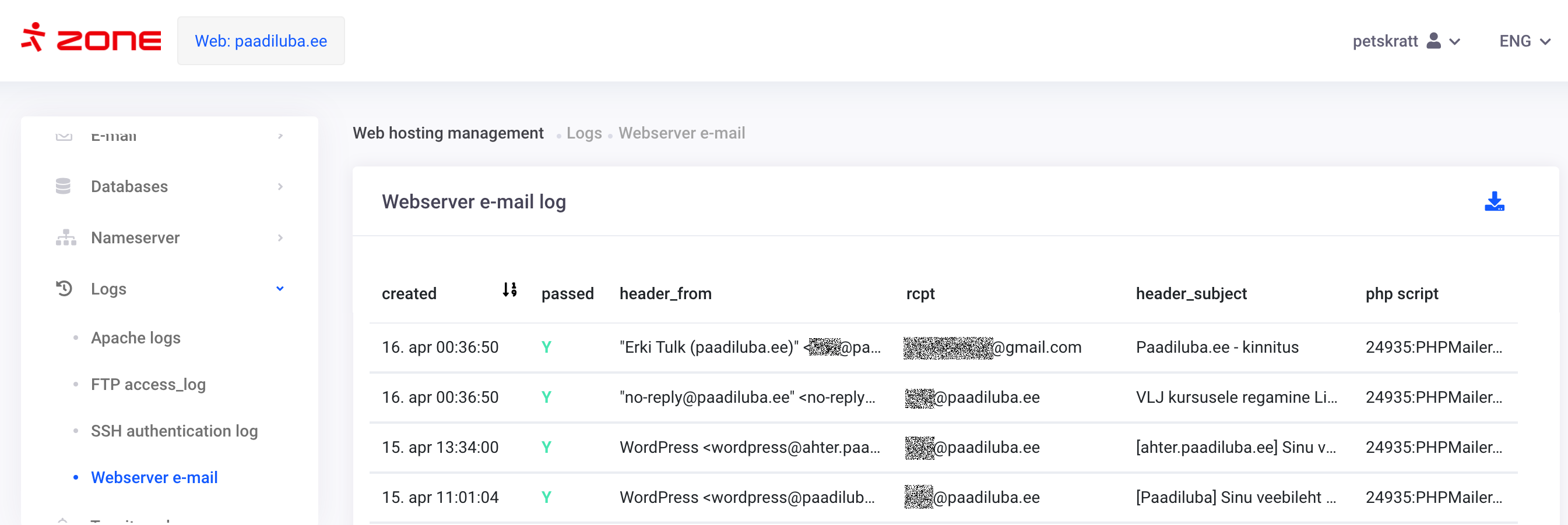 E-mail sent from Shared Hosting web server passes through filter and headers are logged for security and deliverability tracking (see Sending e-mail trough web-server).