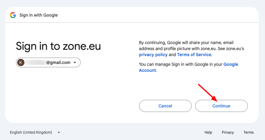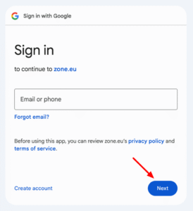 at the top right of the Zone homepage. A login page will open and click Log in with Google