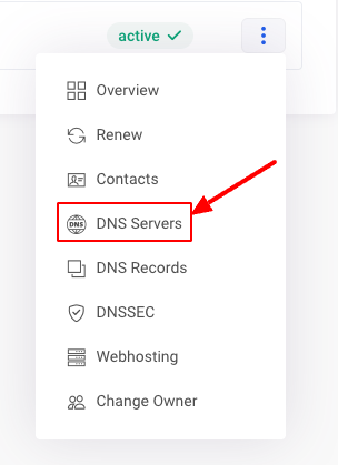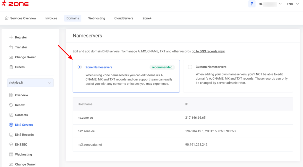 The next page shows which name servers are currently in use. A newly registered domain name use Zone name servers. In order to change nameservers to external ones, click Custom Nameservers