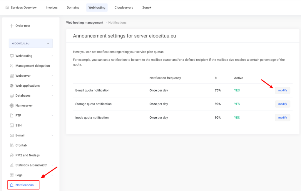 For disk space and inode quota notifications, you can choose whether the notification is sent to the ZoneID account contact email and/or to other desired addresses.