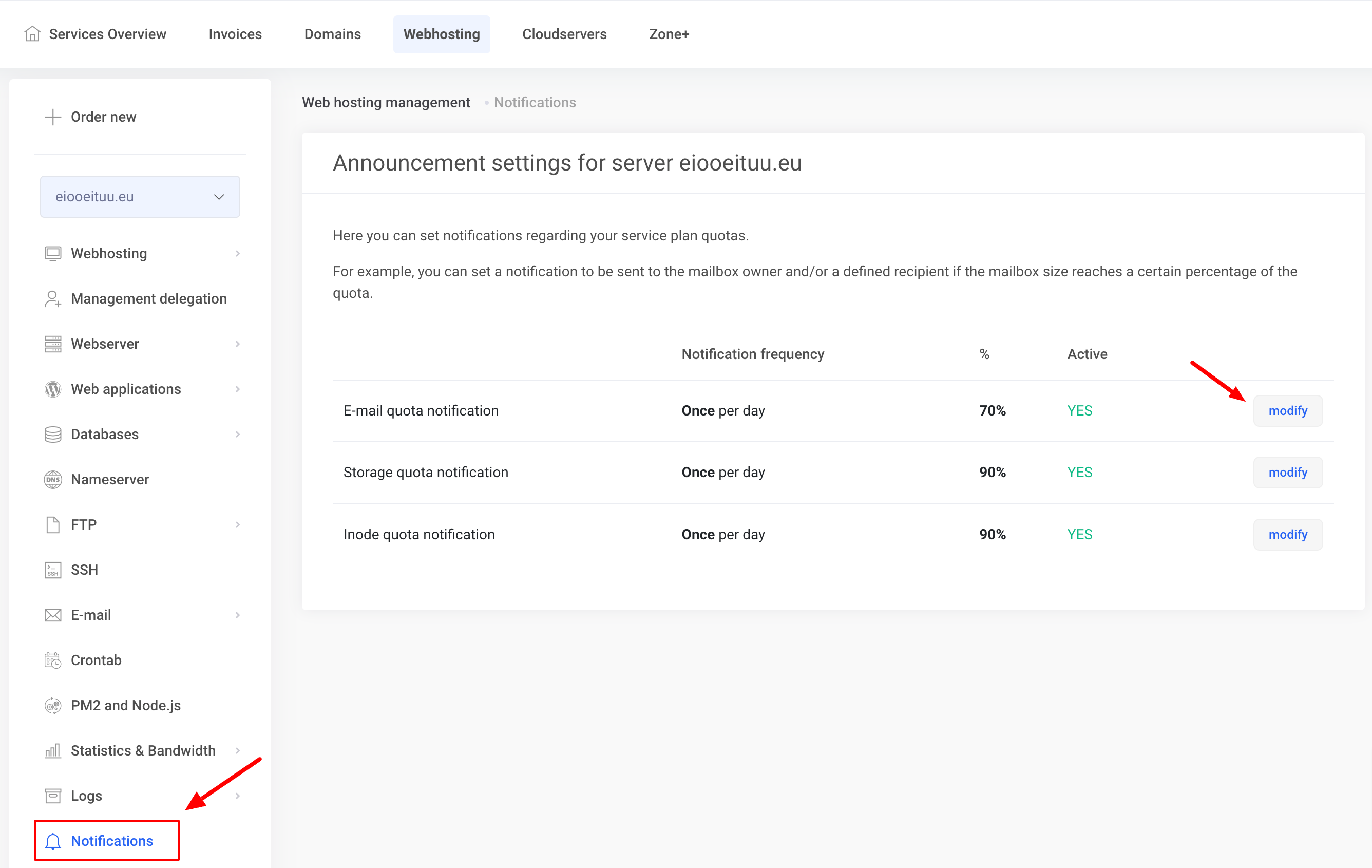 Zone web-hosting offers the option to configure three types of quota notifications: