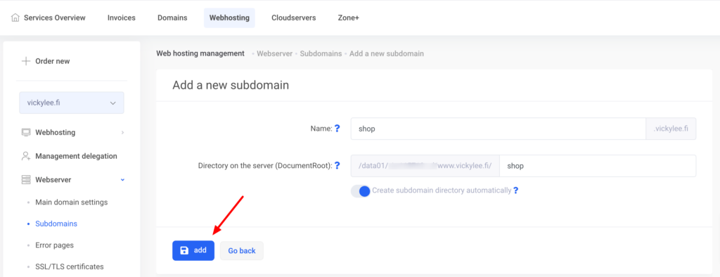 By default, the subdomain name directory is added automatically, but if you want to manually add the directory, then Create subdomain directory automatically