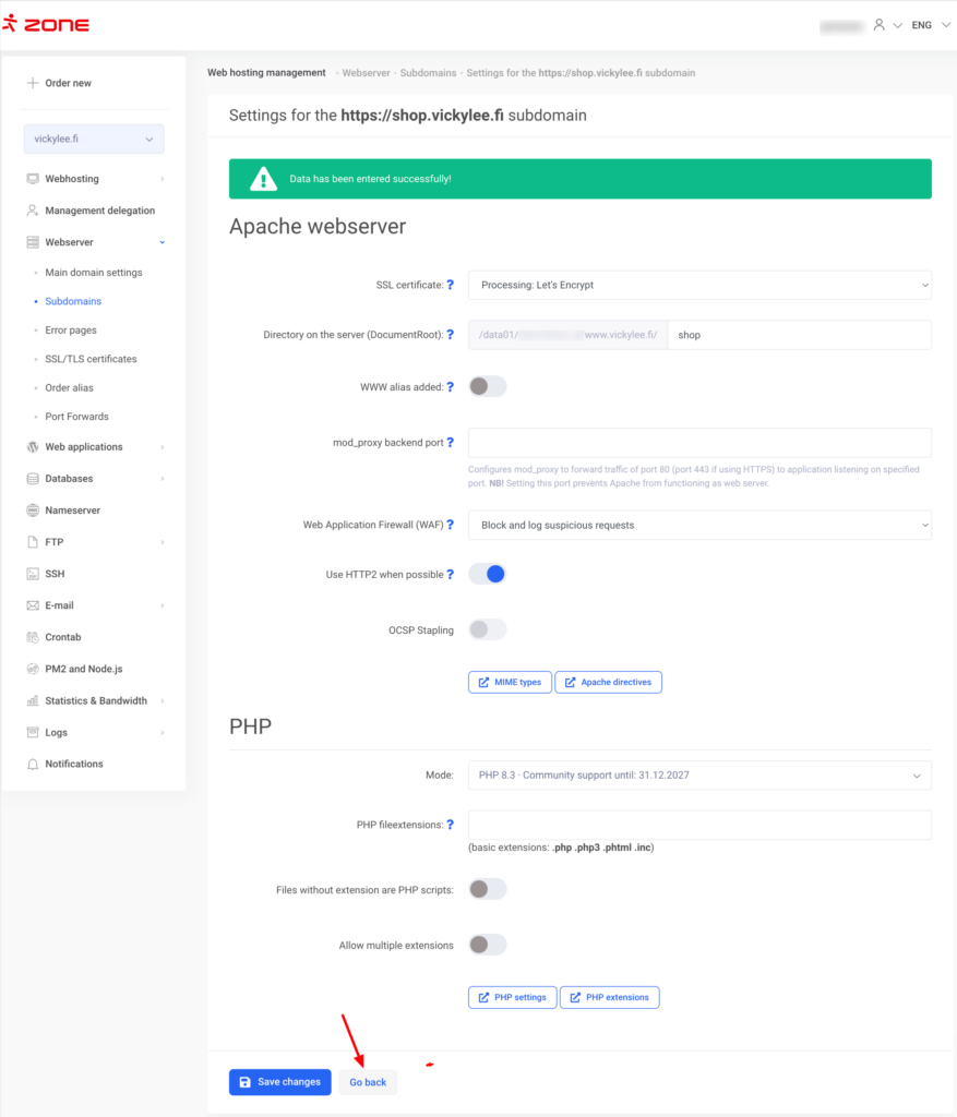 On the next page, you can configure the subdomain further according to your needs and wishes (activate WAF, change PHP version, etc.). If there is no need for special configuration, click Go back.