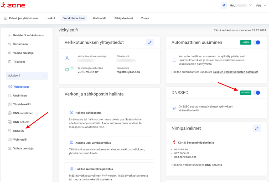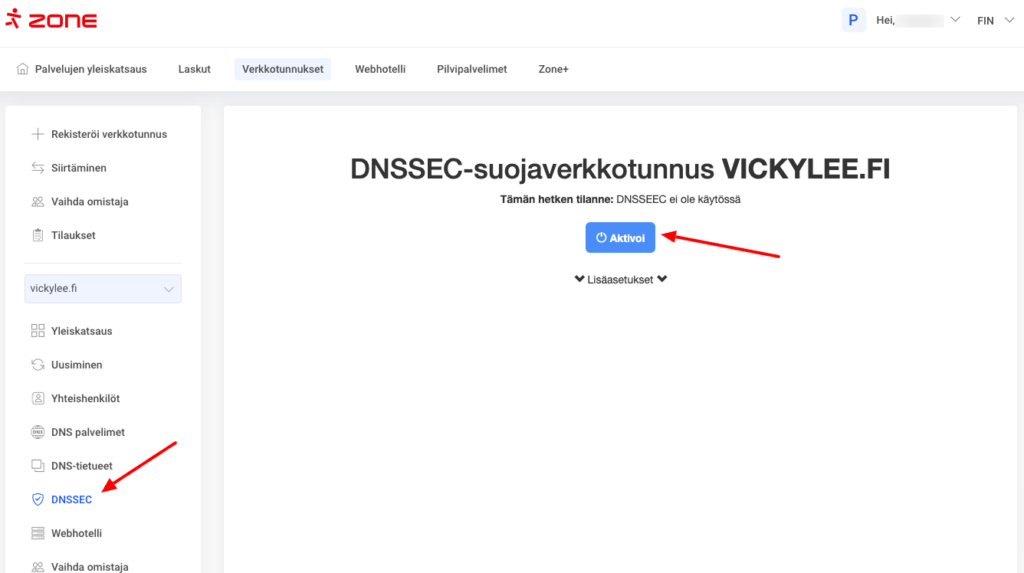 Jos verkkotunnuksesi on rekisteröity Zone:n kautta ja käyttää Zone:n nimipalvelimia, voit aktivoida DNSSEC:n My Zone