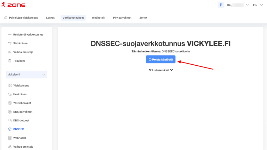 Voit poistaa DNSSEC:n käytöstä My Zone