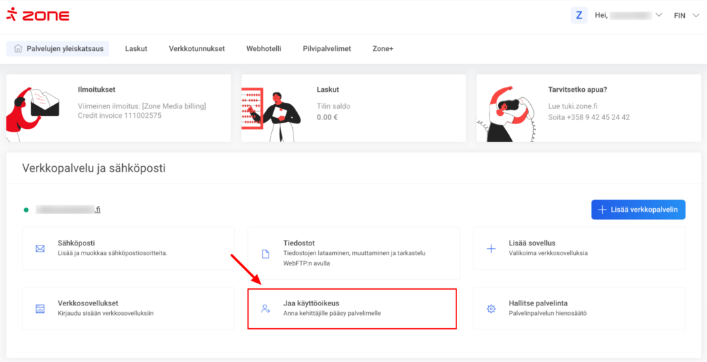 Webhotelli-hallinnan delegoimiseksi palvelun omistajan on ensin kirjauduttava sisään My Zoneen. Valitse sitten Verkkopalvelu ja sähköposti
