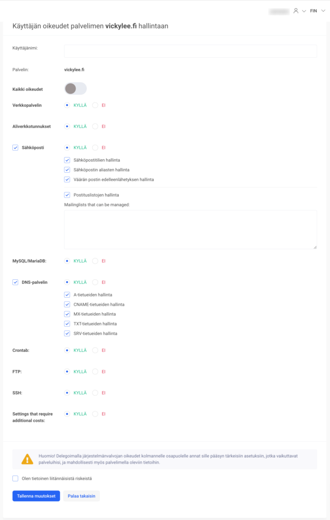 käyttäjätunnus, jolle haluat siirtää hallintaoikeudet, ja valitse, siirretäänkö kaikki mahdolliset oikeudet vai ainoastaan tietyt oikeudet. Kun valinta on tehty ja olet suostunut tiedostavasi mahdolliset riskit klikkaa Tallenna muutokset
