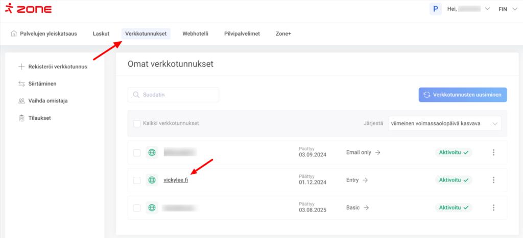 Verkkotunnusten hallinta alueen pääsyoikeuksien jakamiseksi palvelun omistajan on ensin kirjauduttava sisään My Zoneen. Valitse sitten yläreunan valikosta Verkkotunnukset