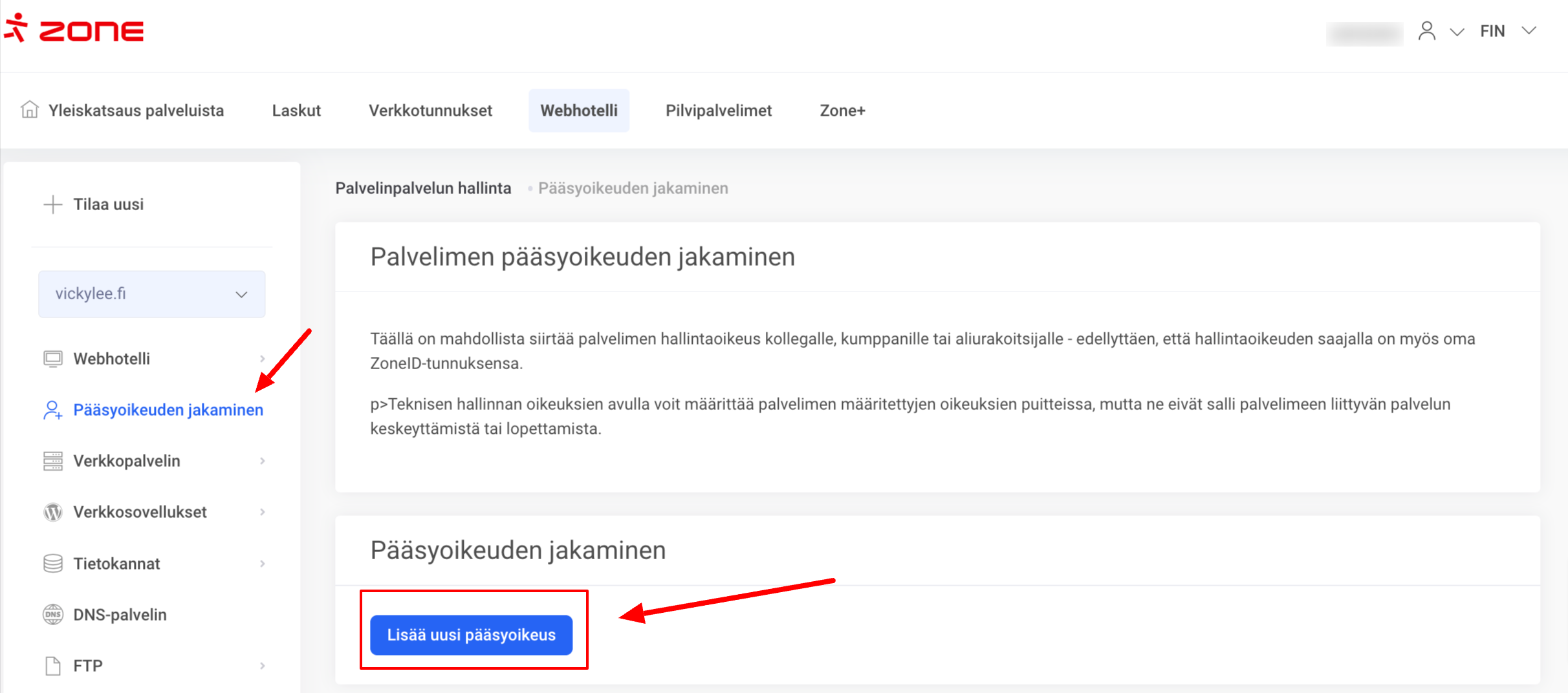 Jos tilillä on useampi kuin yksi webhotellipaketti, avaa oikean palvelimen hallinta ja valitse vasemmalta Pääsyoikeuden jakaminen