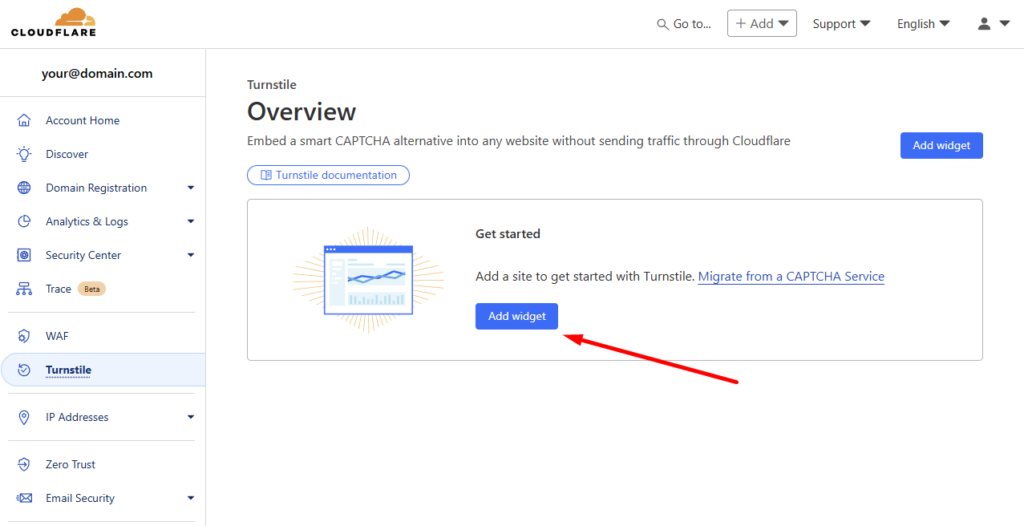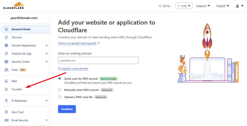 Kun tili on valmis, sinut ohjataan Cloudflare-hallintapaneeliin, jossa sinun on navigoitava Turnstile hallinta-osioon.