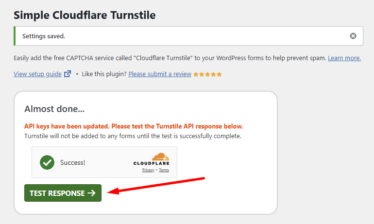 Napsauta vihreää TEST RESPONSE -painiketta, joka ilmestyy näytölle muutosten tallentamisen jälkeen. Jos testi onnistuu, CAPTCHA aktivoituu aiemmin valituilla lomakkeilla. Jos se epäonnistuu, tarkista Site Key ja Secret Key uudelleen.