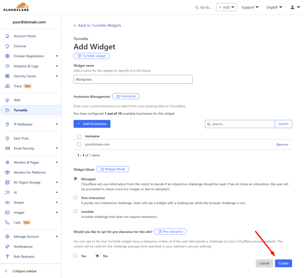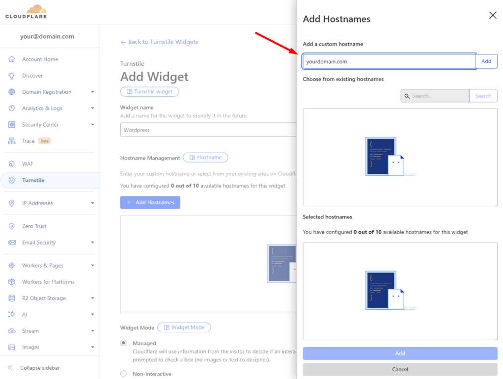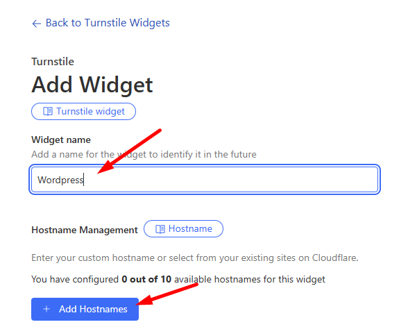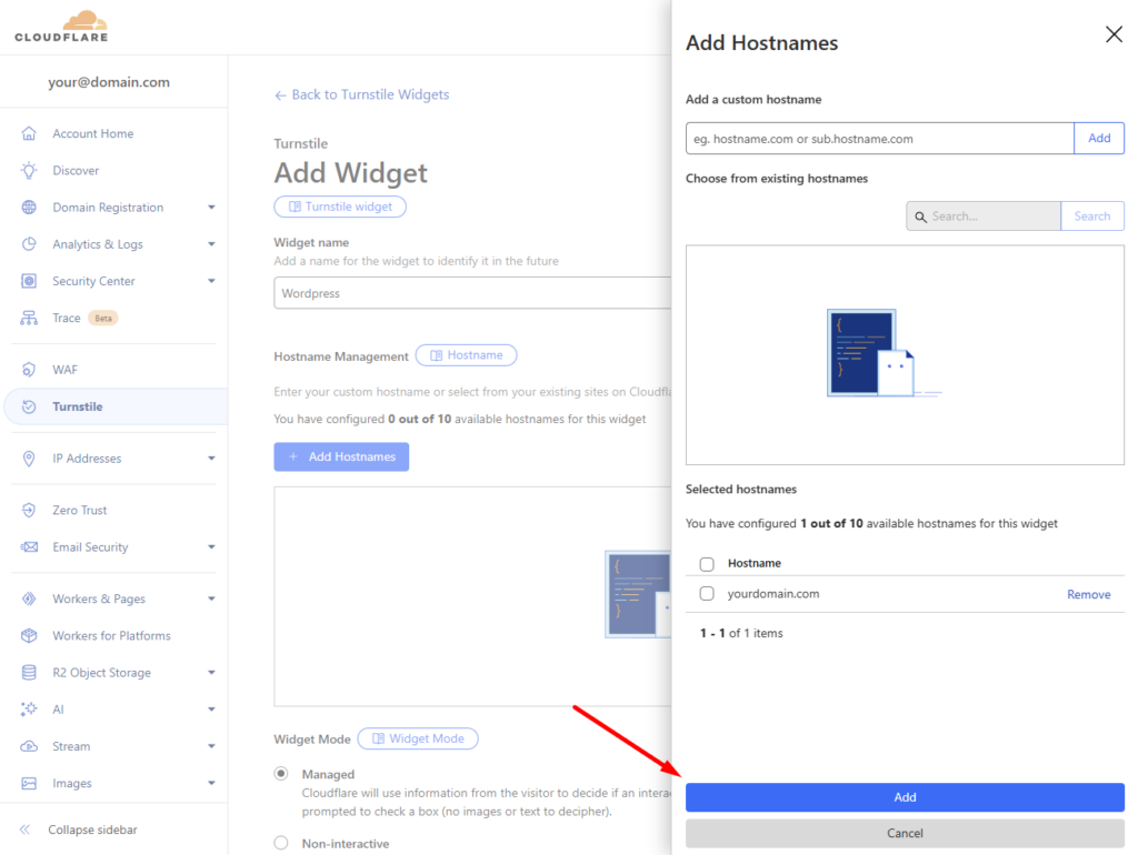 Lisää Turnstile hallinta -osioon uusi CAPTCHA-widget.