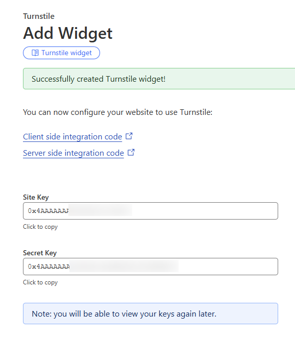 Kun widget on luotu, näet Site Key ja Secret Key parin. Näitä tarvitaan seuraavassa vaiheessa widgetin integroimiseksi verkkosivustoosi. Voit aina käyttää tai luoda nämä avaimet uudelleen Cloudflaren hallintapaneelissa.