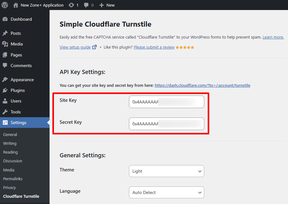 Kun widget on luotu, näet sivuston avaimen. a Avaa WordPress-hallintapaneeli ja asenna Simple Cloudflare Turnstile-laajennus, avaa sitten sen asetukset ja syötä edellisessä vaiheessa määritetty Site Key ja Secret Key.
