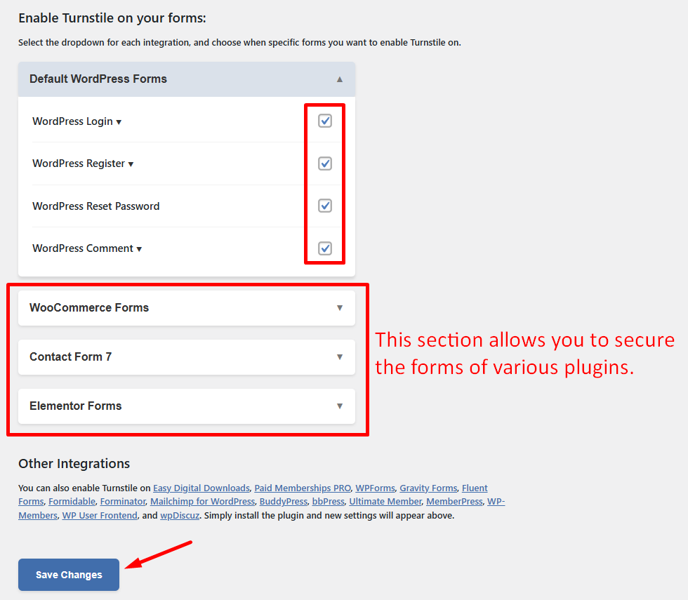 Vieritä alas valitaksesi kaikki suojattavat lomakkeet. Voit suojata lomakkeita myös muilta lisäosilta WordPressin omien lomakkeiden lisäksi.