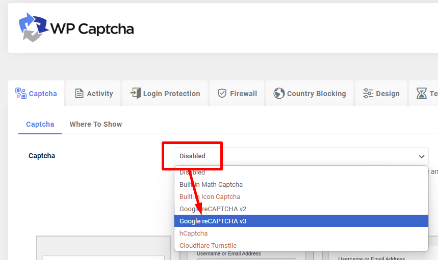 Avaa laajennuksen asetukset ja valitse CAPTCHA-tyypiksi Google reCAPTCHA v3.