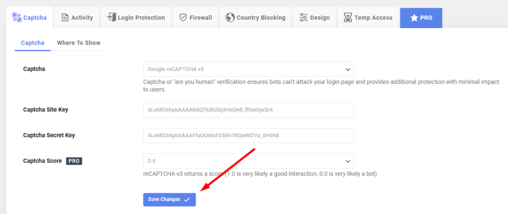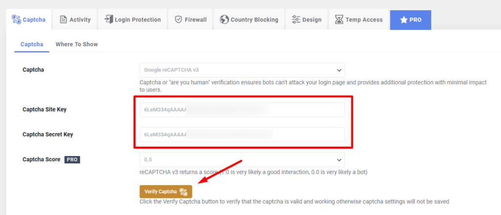 Syötä Site Key ja Secret Key niille tarkoitettuihin kenttiin. Varmista, että avaimet ovat oikein, napsauttamalla Verify Captcha.