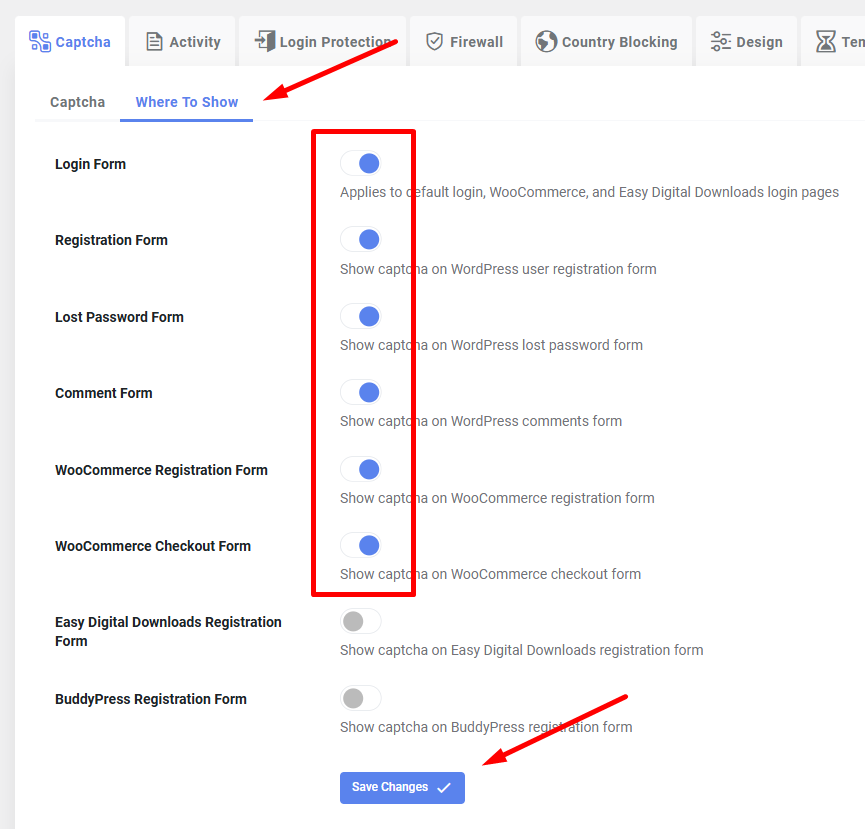 Valitse Where To Show-välilehdeltä, mitkä lomakkeet CAPTCHA-suojataan.