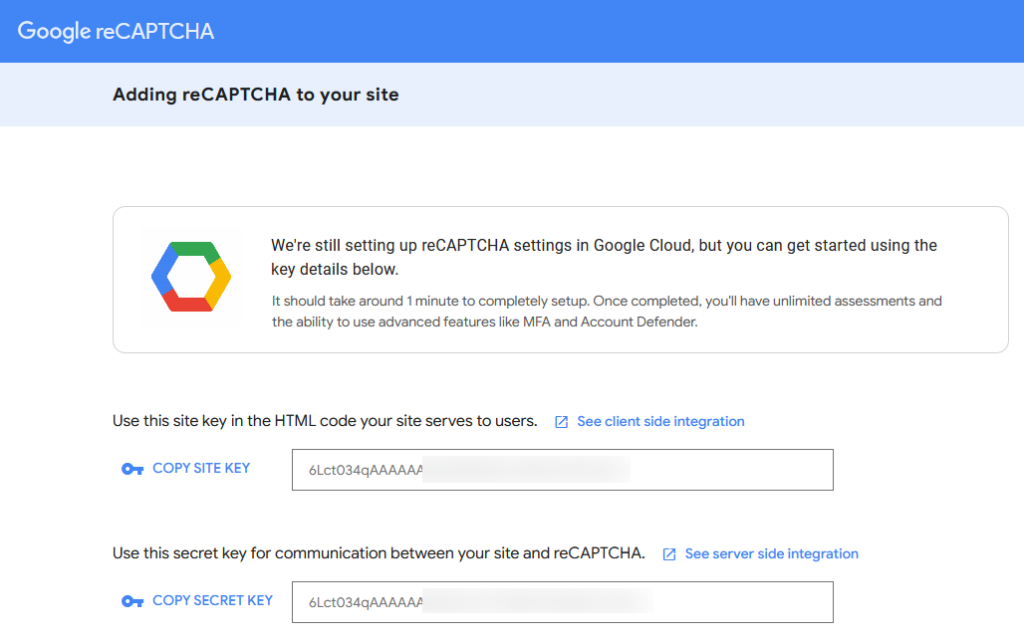 Näet seuraavalla näytöllä Site Key ja Secret Key parin. Näitä käytetään seuraavassa vaiheessa reCAPTCHA:n integroimiseksi verkkosivustoosi. Voit tarkastella näitä avaimia milloin tahansa Googlen reCAPTCHA-hallintapaneelissa.