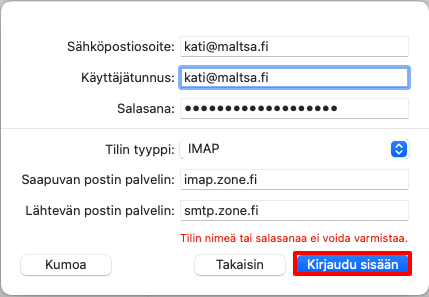 - Saapuvan sähköpostin IMAP-palvelin: imap.zone.fi portti 993.