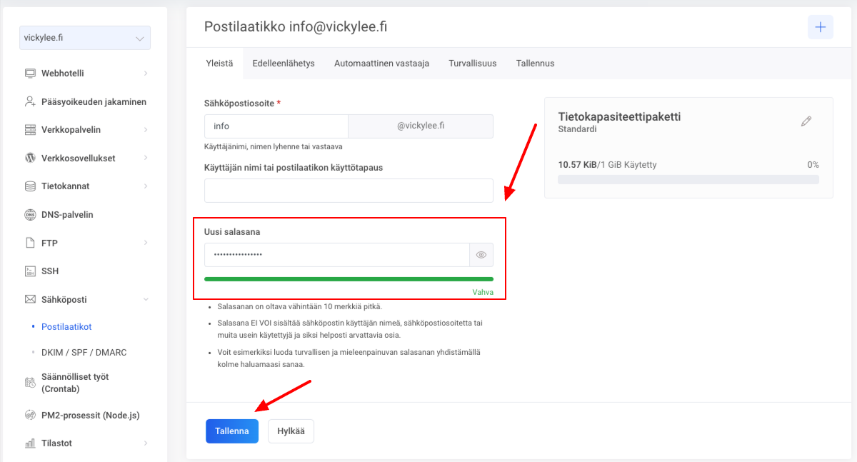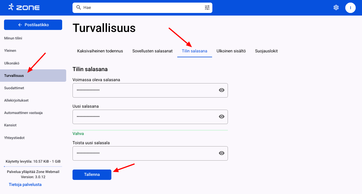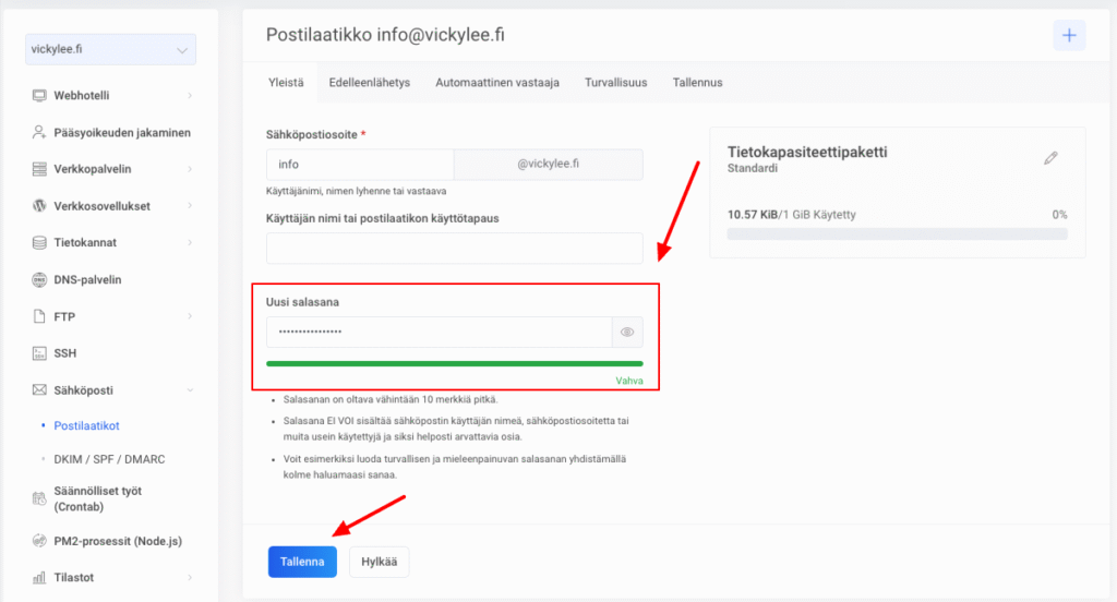 Kirjoita nykyinen salasana ja uusi salasana kahdesti ja napsauta Tallenna