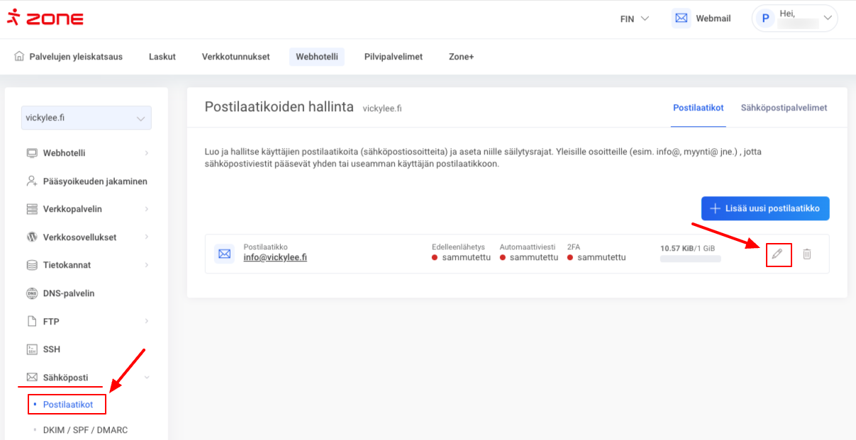 -hallintapaneeliin, voit vaihtaa salasanan webmailin kautta, jos tiedät postilaatikon nykyisen salasanan.